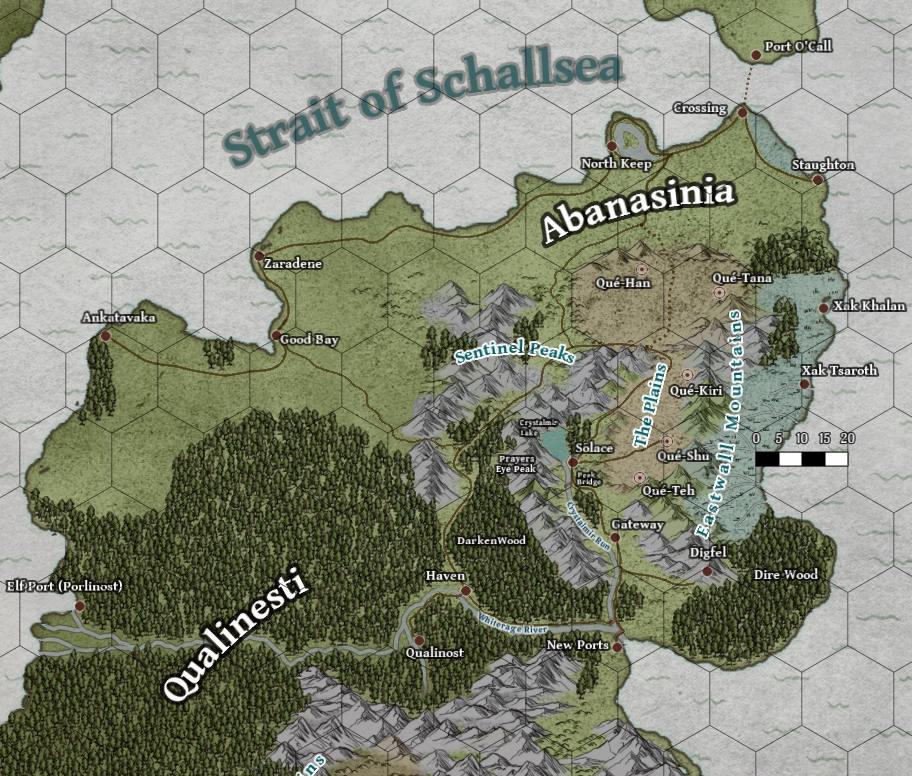 Crossing (small Town, 1,888). Established during the years following the Cataclysm. Located directly across the mouth of the New Sea from the town of Port O’Call, the town of Crossing started out as nothing more than a landing site near a rise that overlooked the Plains of Abanasinia. As it became clear that the location was one of the most likely spots of ships to make dock, a group of merchants from Caergoth, looking to establish their own port to the lands of the south, began building docks and the site started to attract journeymen and refugees. Requiring a way to protect themselves and their investments against pirates and attacks from warring plainsmen, the merchants formed the Scales Society, a guild in which every tradesman, no matter how big or small would contribute to the defense of the town through a tithe of their annual income. From this, the Town guard, coast guard, and bureaucrats are paid.